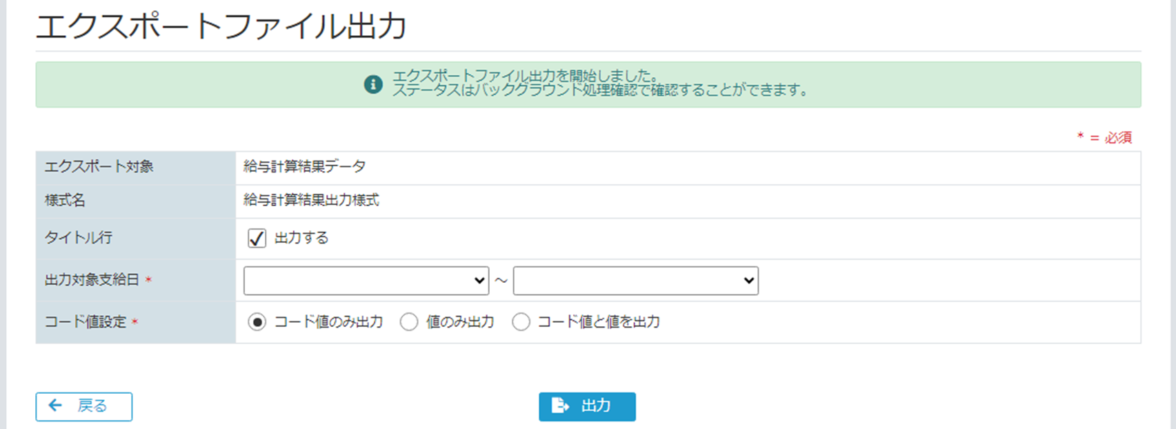 | 出力対象支給日 | ※データ分類が「計算入力データ」「計算結果データ」「明細データ」「社会保険データ」の場合 ※データ分類が「従業員情報データ」、且つデータ種類が「本人情報」「口座情報」「通勤経路」「家族情報」の場合 出力対象の支給日を選択してください。 |