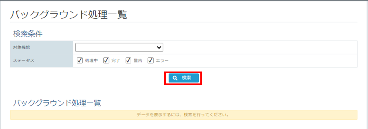 [バックグラウンド処理一覧画面]で、[検索ボタン]をクリックしてください。