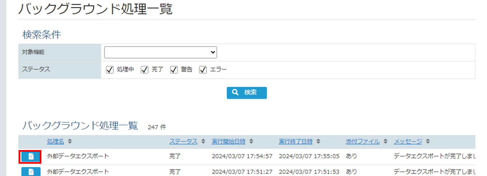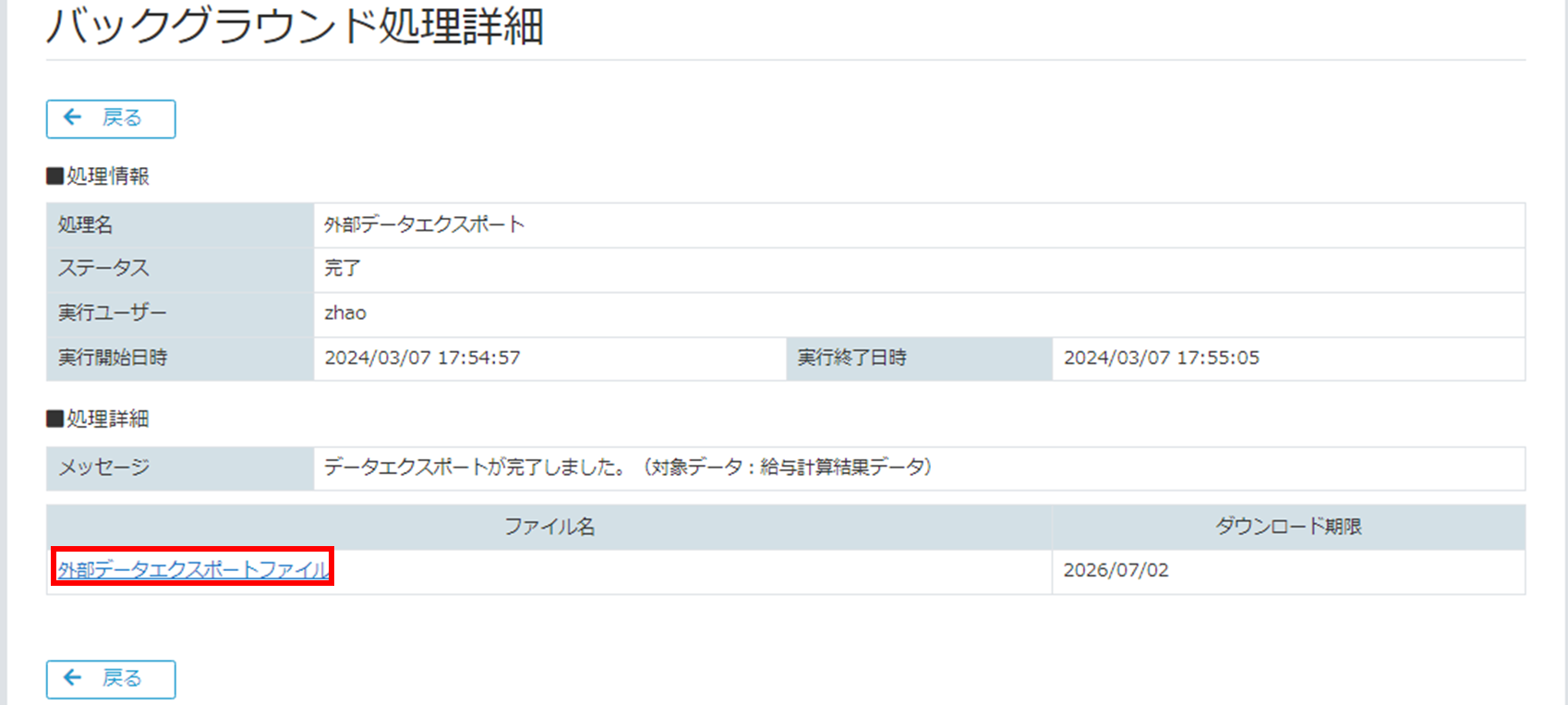 [バックグラウンド処理詳細画面]に遷移します。処理詳細のメッセージで、正常にエクスポートが完了したことを確認し、[外部データエクスポートファイルリンク]をクリックしてデータをダウンロードしてください。