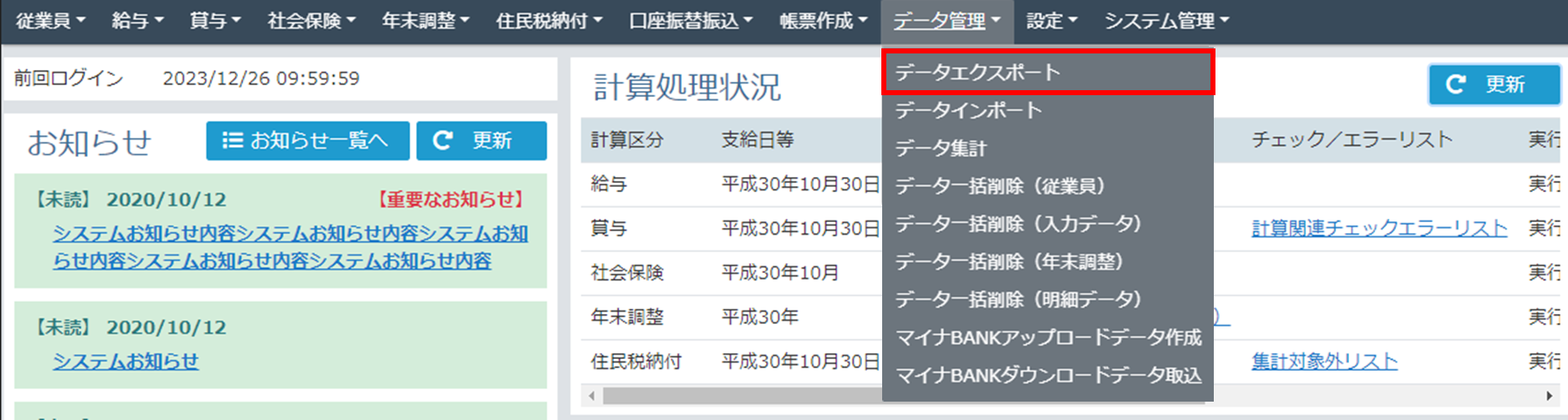 給与計算結果データ、賞与計算結果データ、年末調整計算結果データ、社会保険計算結果データ