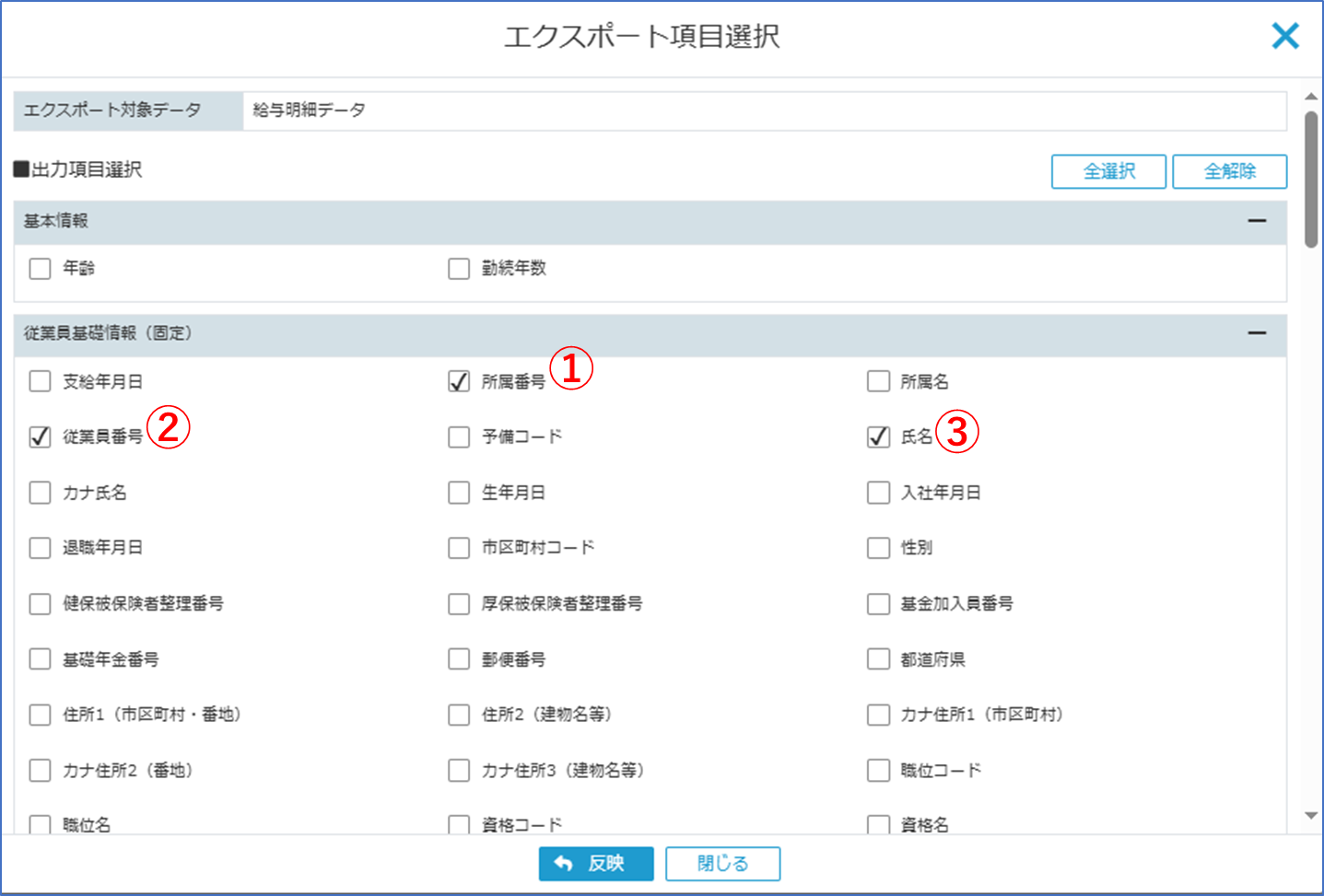 [所属番号][従業員番号][氏名]にチェックをつけて[反映ボタン]をクリックします。
