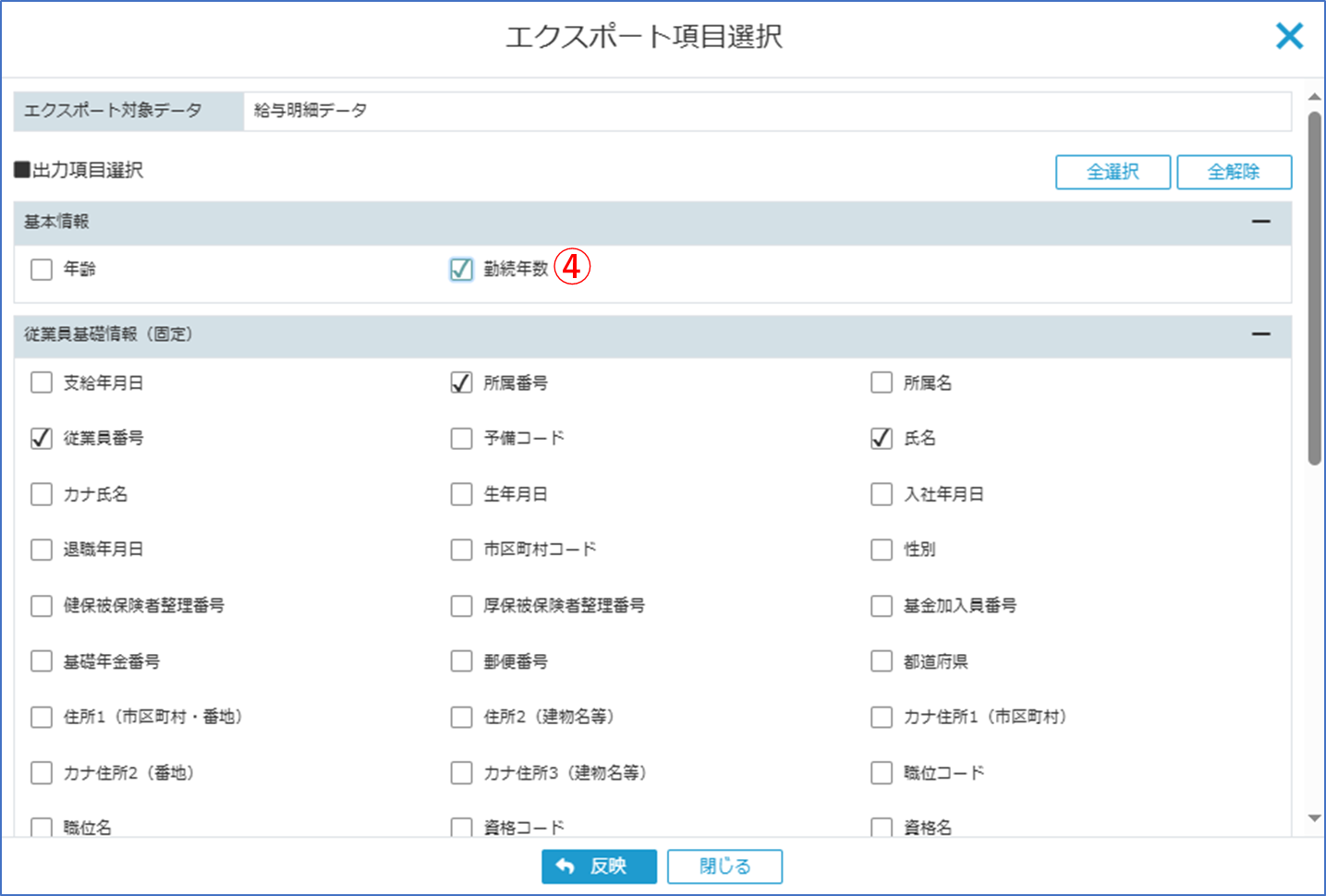 [エクスポート項目選択画面]にて[勤続年数]にチェックをつけて[反映ボタン]をクリックします。