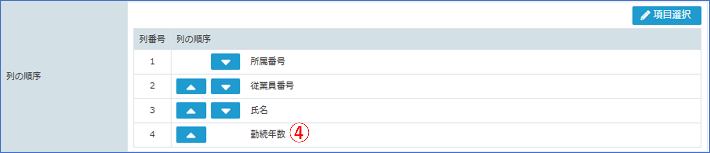 | 列の順序 | [列の順序]に表示されている順番に出力されます。 順番を変更したい場合は各項目の[矢印ボタン]をクリックして編集してください。 |