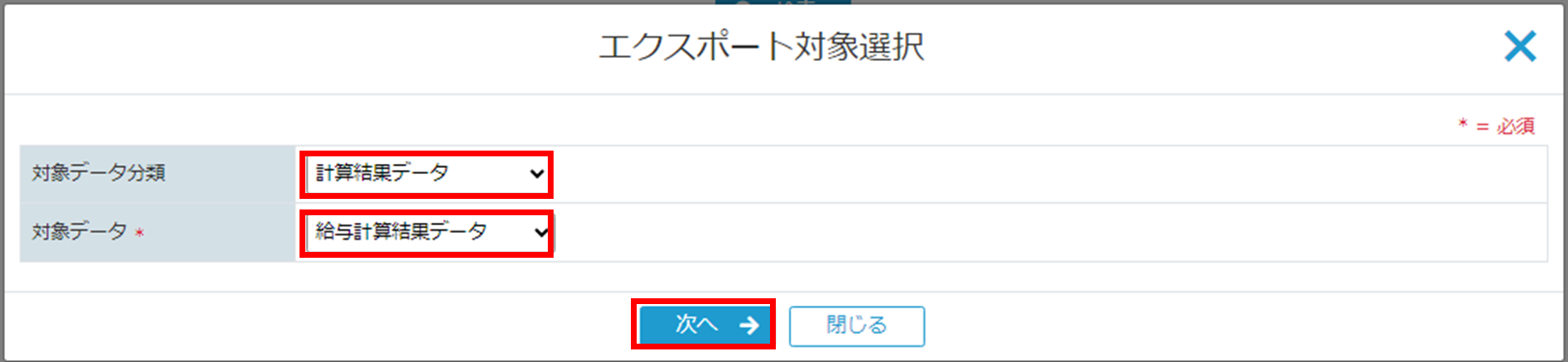 [エクスポート対象選択画面]に遷移します。「対象データ分類」、「対象データ」を選択し、[次へボタン]をクリックします。
