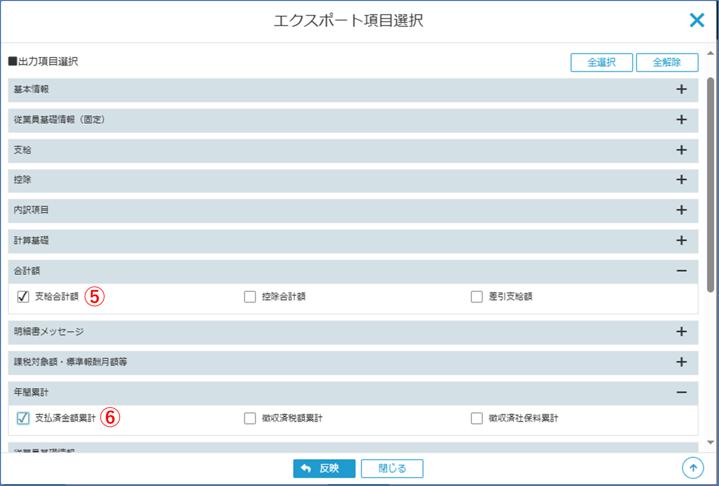 項目グループ[合計額]の[支給合計額]と、項目グループ[年間累計額]の[支払済金額累計]にチェックをつけて[反映ボタン]をクリックします。
