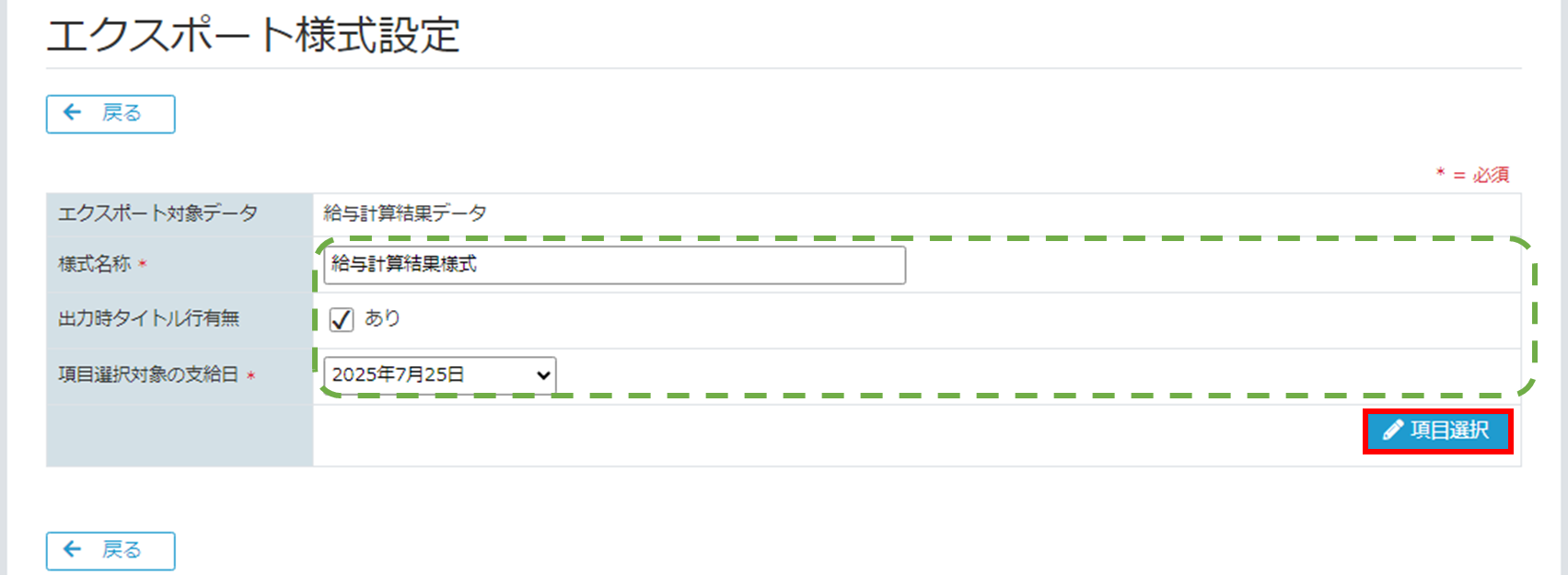 [エクスポート様式設定画面]に遷移します。入力項目を入力して、[項目選択ボタン]をクリックしてください。