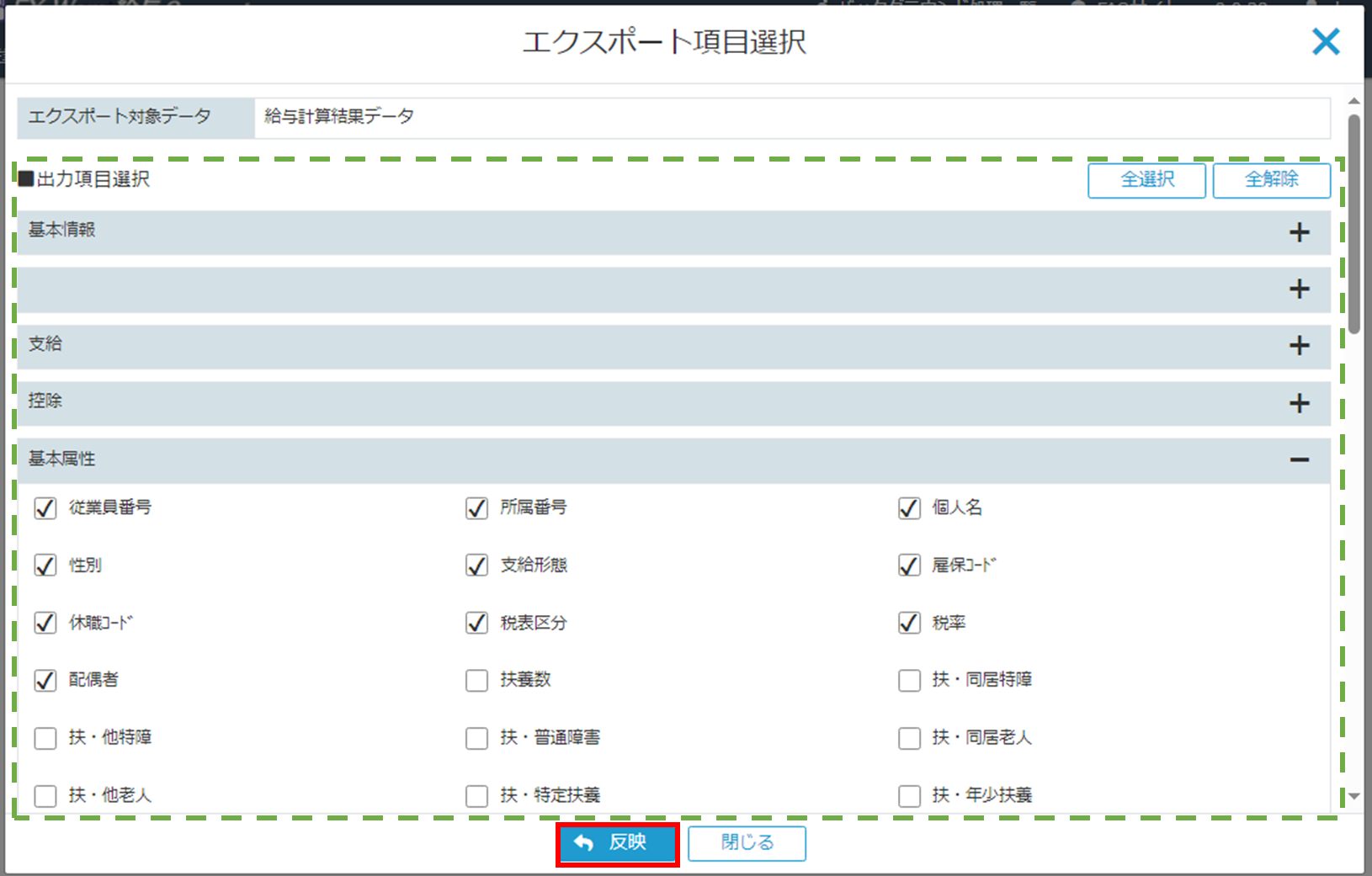 [エクスポート項目選択画面]に遷移します。出力したい項目をチェックして、[反映ボタン]をクリックしてください。