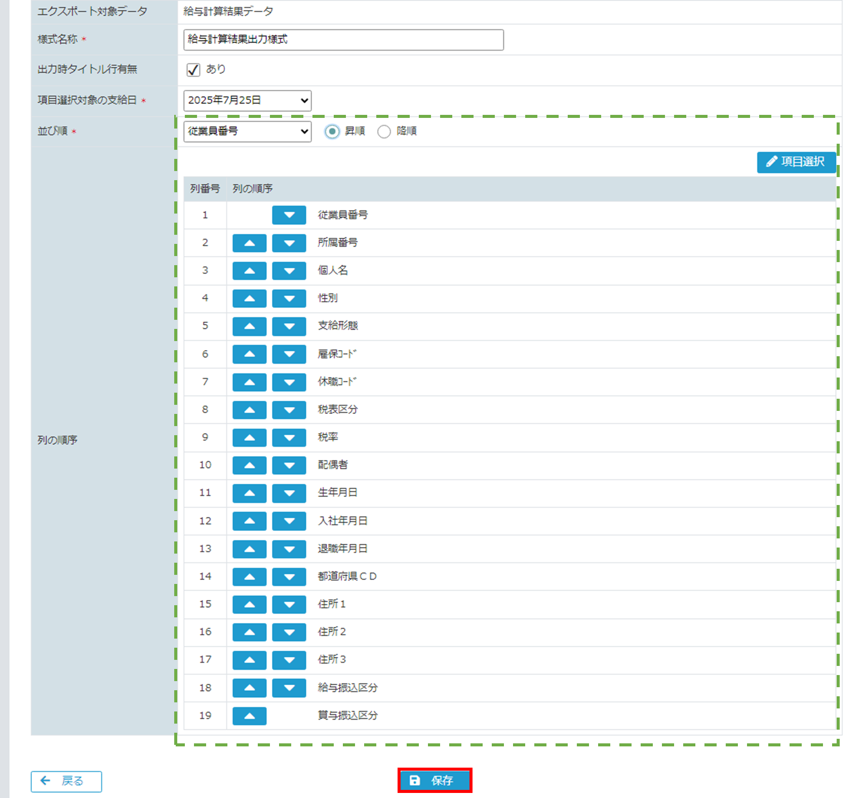 [エクスポート様式設定画面]に項目が反映されます。データの並び替え設定と項目の出力順を設定し、[保存ボタン]をクリックしてください。