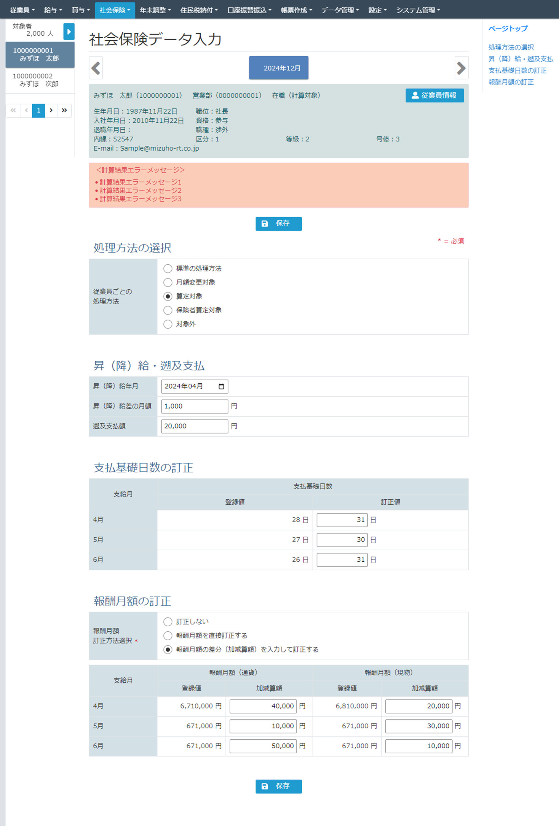 [報酬月額訂正方法選択]を変更することで画面表示を切り替えることができます。