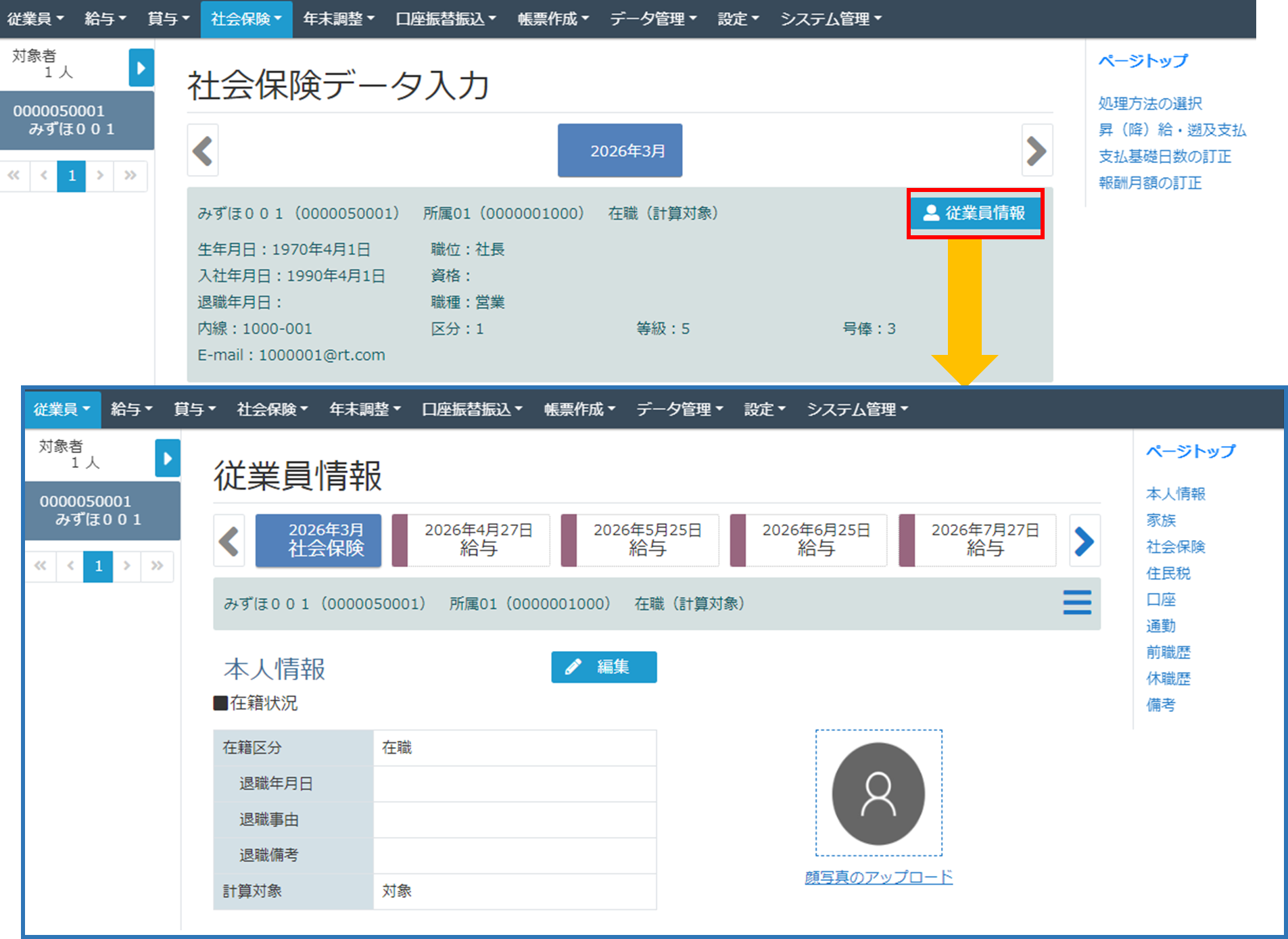右上に[従業員情報ボタン]が表示されている場合、そちらをクリックすることで当画面で選択している従業員の情報を[従業員情報画面]で表示することができます。