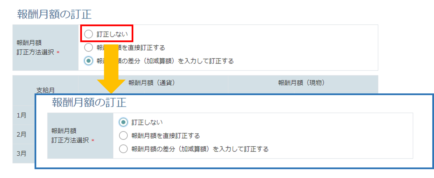 | 報酬月額訂正方法選択 | 報酬月額の訂正方法を 「訂正しない」 「報酬月額を直接訂正する」 「報酬月額の差分(加減算額)を入力して訂正する」 から選択してください。 ・「訂正しない」は、報酬月額の訂正が不要な場合に選択してください。報酬月額の入力欄が表示されなくなります。 ・「報酬月額を直接訂正する」は、入力した金額で報酬月額を置き換えたい場合に選択してください。 ・「報酬月額の差分(加減算額)を入力して訂正する」は、現在登録されている値に今回入力した値を加算または減算して訂正したい場合に選択してください。 |